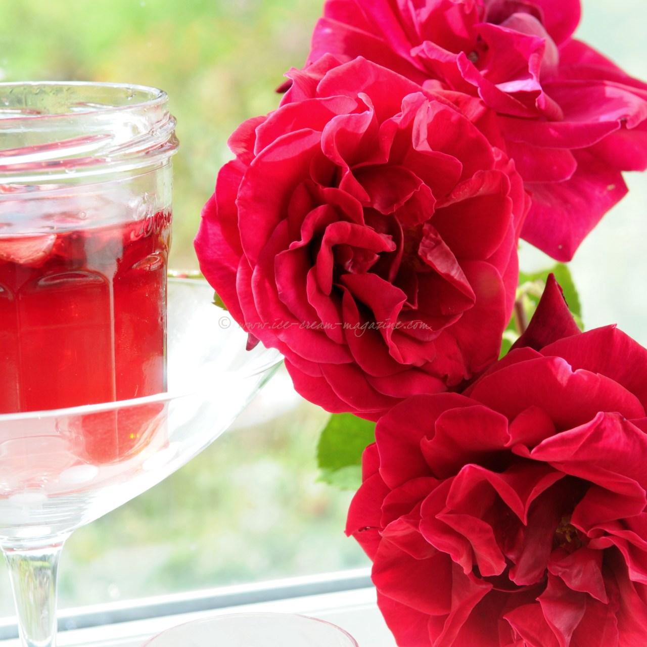 To make the rose petal syrup, add fresh, fragrant, deep red rose petals to simple stock syrup, combine and fill to the top of an airtight jar to steep and impart flavour and fragrance, drain and retain syrup after 24 hours. Note: This will only keep refrigerated for a couple days.
