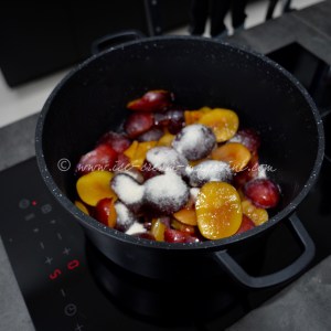 To this seasons, stunningly coloured, stoned fruit gently braised in a little sugar and and roughly half water to weight of fruit. The plum-pious-ness then left to cool. If I don’t stop ‘tasting it’ there will be none left.  A ‘jolly decent slug’ of Amaretto liqueur swirled to combine. The permeation will gift your writer to further taste, but only in the interest of her kindly readers. OK the quantity has incomprehensibly shrunk, evaporated, simply disappeared.