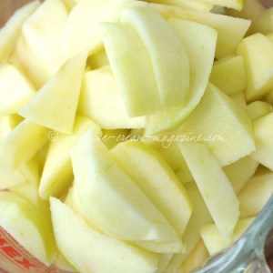 Firm, sharp apples, tart cookers or eating apples are the key. Peeled, cored and swiftly chunked before they turn brown. Neat, fresh lemon juice (and a sprinkling of sugar if the apples need it) keeps the colour and sharpness in tact.  Acidulated water may suit some but I find it waters down the flavour so (hard core here) adding umpmph if they need cheering up.