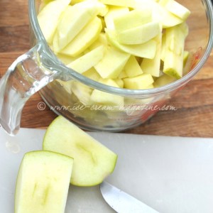 Firm, sharp apples, tart cookers or eating apples are the key. Peeled, cored and swiftly chunked before they turn brown. Neat, fresh lemon juice (and a sprinkling of sugar if the apples need it) keeps the colour and sharpness in tact.  Acidulated water may suit some but I find it waters down the flavour so (hard core here) adding umpmph if they need cheering up.