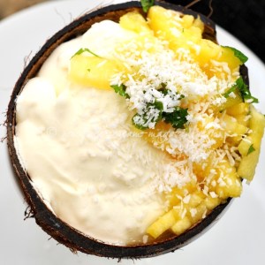 Loosely …. Equal measures heavy/double cream cream whizzed together with roughly the same of coconut milk. I had 2 cans of coconut milk and roughly the same in tubs of chilled double cream. Sweeten to suit, add desiccated coconut if you like. I also trickled in some corn syrup, but then used icing sugar in other batches.