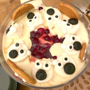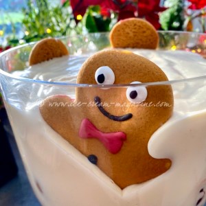 3 layers of amaretti biscuits, and then the crumbs from the bottom on the jar were cascaded with a flourish (sprinkled over the top). Serve with chocolate coins, and a chocolate moose, no not mouse, not mousse, a moose!